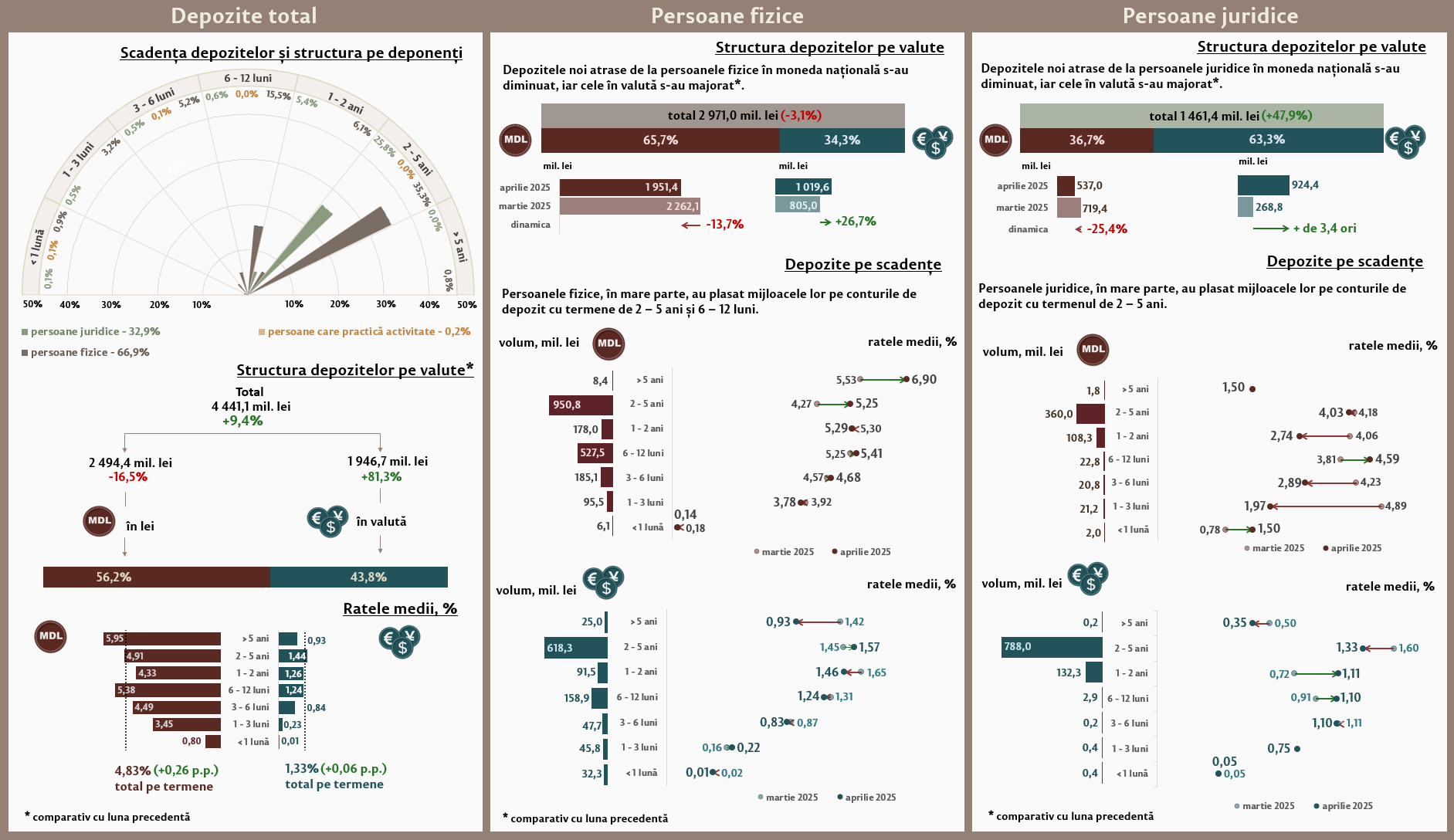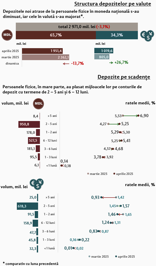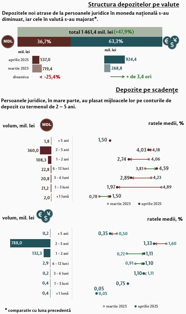 În luna aprilie 2025, depozitele noi1 atrase la termen (Infografic 1) au constituit 4 441,1 milioane lei, majorându-se cu 9,4 la sută față de luna martie 2025. Depozitele atrase în moneda națională au înregistrat o pondere de 56,2 la sută și au însumat 2 494,4 milioane lei, fiind în descreștere cu 16,5 la sută față de luna precedentă. Depozitele atrase în valută au totalizat 1 946,7 milioane lei, înregistrând o creștere cu 81,3 la sută față de luna precedentă.