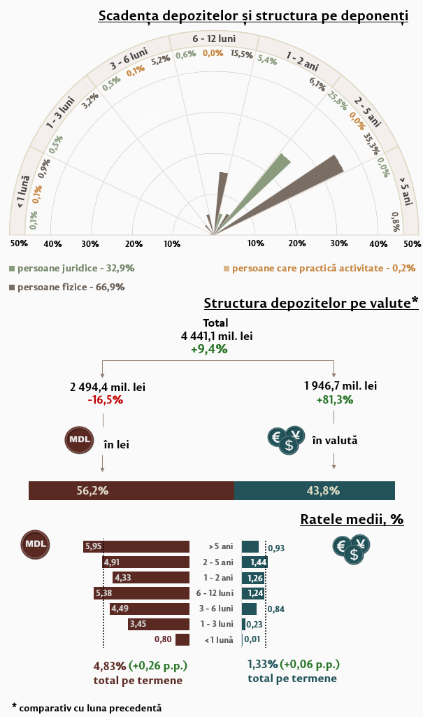 Rata medie la depozitele atrase în moneda națională de la persoanele fizice, comparativ cu luna precedentă, s-a majorat cu 0,46 p.p., până la nivelul de 5,16 la sută. Rata medie la depozitele atrase în valută s-a majorat cu 0,17 p.p. și a constituit 1,35 la sută.