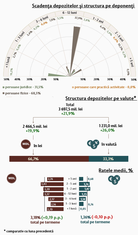 Depozitele persoanelor fizice au constituit în luna de referință 2 531,9 milioane lei, în creștere cu 16,1 la sută comparativ cu luna precedentă (Infografic 2). Cele mai solicitate au fost depozitele cu termene de la 6 până la 12 luni, cu o pondere de 55,4 la sută în totalul depozitelor persoanelor fizice.