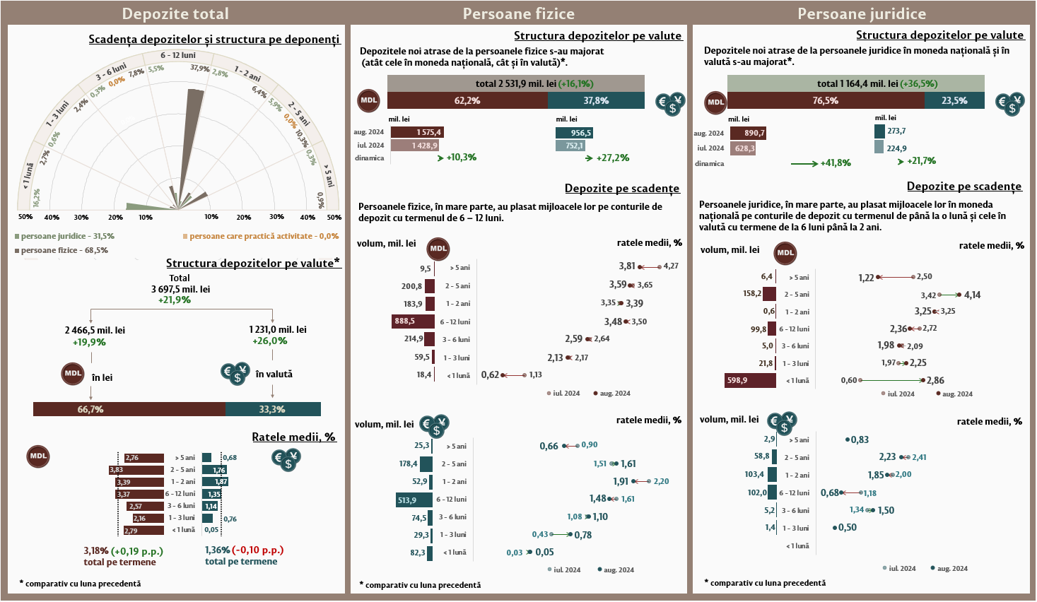 În luna august 2024, depozitele noi1 atrase la termen (Infografic 1) au constituit 3 697,5 milioane lei, majorându-se cu 21,9 la sută față de luna iulie 2024. Depozitele atrase în moneda națională au înregistrat o pondere majoră de 66,7 la sută și au însumat 2 466,5 milioane lei, în creștere cu 19,9 la sută față de luna precedentă. Depozitele atrase în valută au totalizat 1 231,0 milioane lei, fiind în creștere cu 26,0 la sută față de luna precedentă.