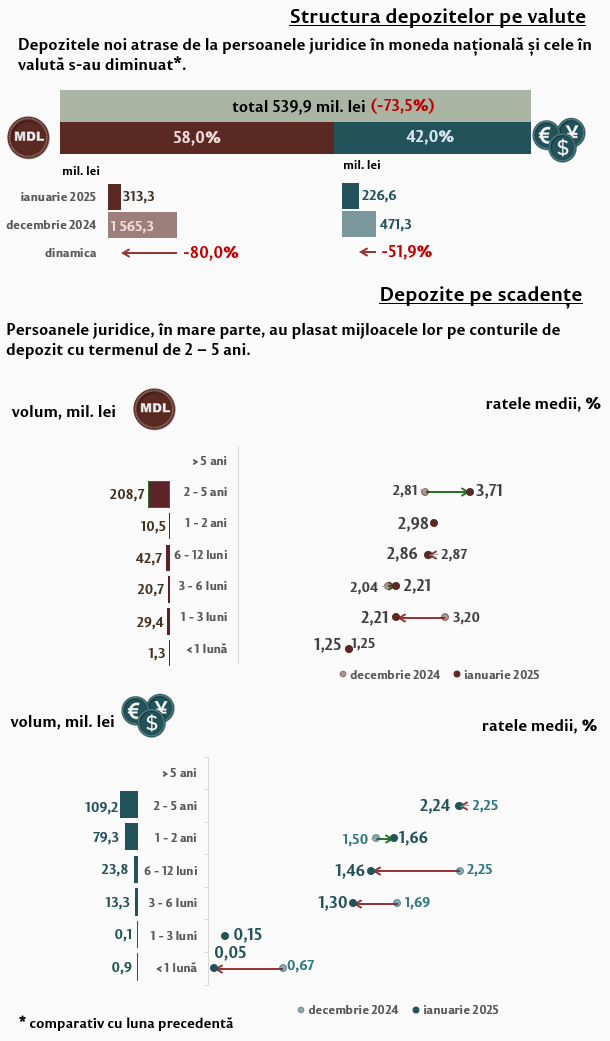 În ianuarie 2025, comparativ cu luna precedentă, depozitele în moneda națională ale persoanelor juridice (Infografic 3) au înregistrat o descreștere majoră - cu 80,0 la sută, iar cele în valută s-au diminuat cu 51,9 la sută. Depozitele în moneda națională ale persoanelor juridice au constituit 313,3 milioane lei, iar cele în valută – 226,6 milioane lei. Comparativ cu ianuarie 2024, depozitele în moneda națională ale persoanelor juridice s-au diminuat cu 60,7 la sută, iar cele în valută s-au majorat cu 30,1 la sută.