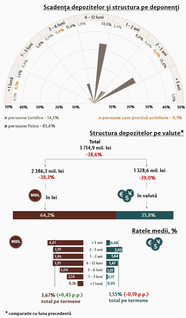 Rata medie la depozitele atrase în moneda națională de la persoanele fizice, comparativ cu luna precedentă, s-a majorat cu 0,17 p.p., până la nivelul de 3,73 la sută. Rata medie la depozitele atrase în valută s-a diminuat cu 0,15 p.p. și a constituit 1,48 la sută.