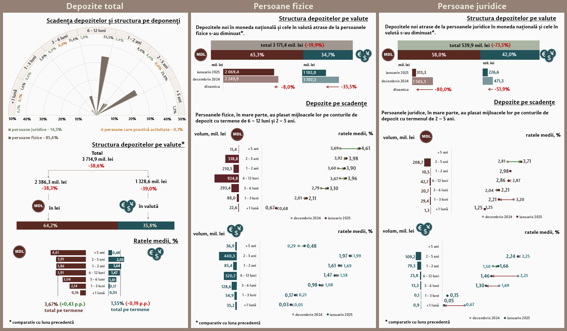 În luna ianuarie 2025, depozitele noi1 atrase la termen (Infografic 1) au constituit 3 714,9 milioane lei, micșorându-se cu 38,6 la sută față de luna decembrie 2024. Depozitele atrase în moneda națională au înregistrat o pondere de 64,2 la sută și au însumat 2 386,3 milioane lei, fiind în descreștere cu 38,3 la sută față de luna precedentă. Depozitele atrase în valută au totalizat 1 328,6 milioane lei, înregistrând o descreștere cu 39,0 la sută față de luna precedentă.