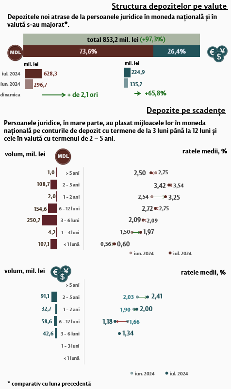 În iulie 2024, comparativ cu luna precedentă, depozitele în moneda națională ale persoanelor juridice (Infografic 3) s-au majorat de 2,1 ori, iar cele în valută cu 65,8 la sută. Depozitele în moneda națională ale persoanelor juridice au constituit 628,3 milioane lei, iar cele în valută – 224,9 milioane lei.