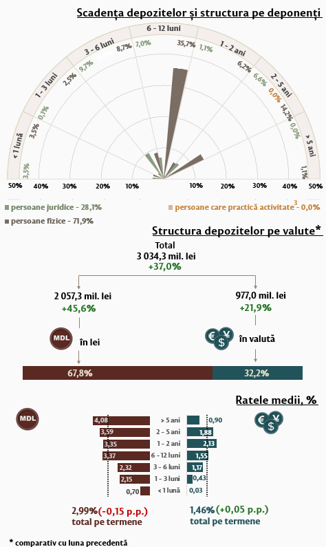 Din perspectiva termenelor de plasare, cea mai mare pondere în totalul depozitelor la termen le-a revenit depozitelor cu termene de la 6 până la 12 luni (42,7 la sută) și depozitelor cu termene de la 2 până la 5 ani (20,8 la sută).