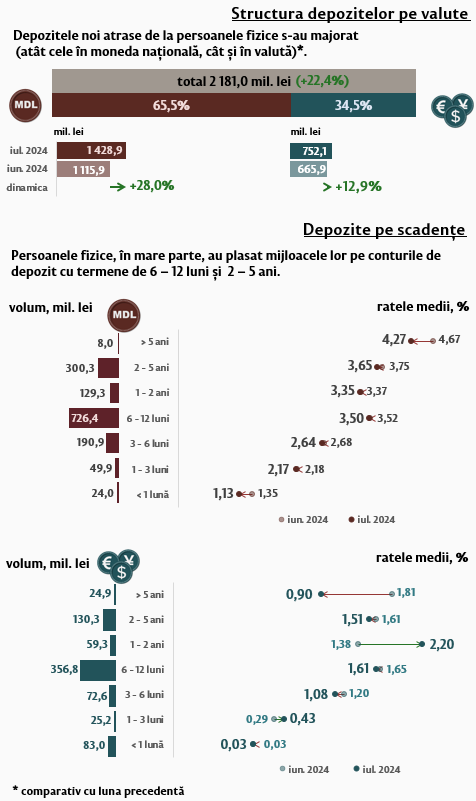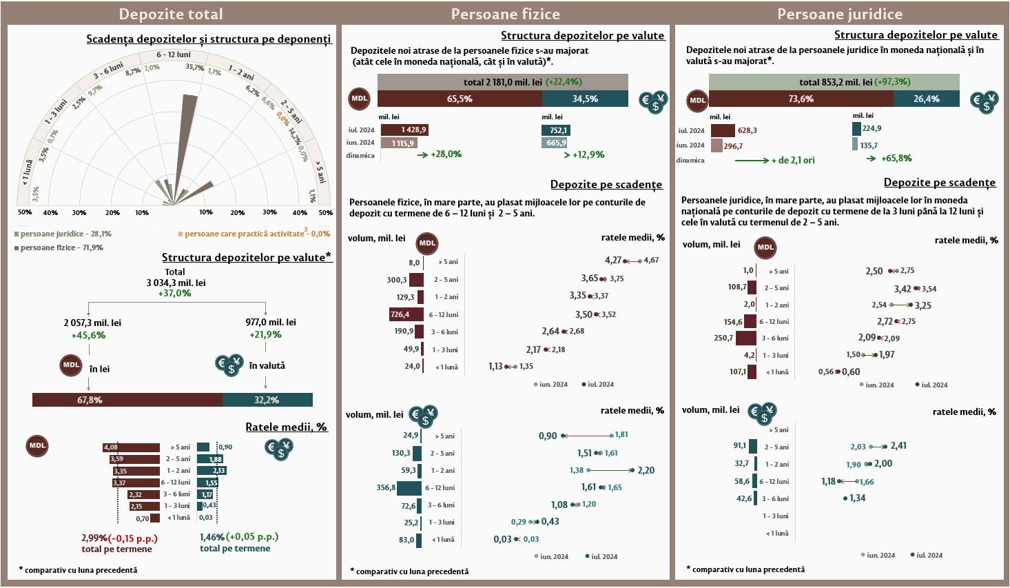 În luna iulie 2024, depozitele noi1 atrase la termen (Infografic 1) au constituit 3 034,3 milioane lei, majorându-se cu 37,0 la sută față de luna iunie 2024. Depozitele atrase în moneda națională au înregistrat o pondere majoră de 67,8 la sută și au însumat 2 057,3 milioane lei, în creștere cu 45,6 la sută față de luna precedentă. Depozitele atrase în valută au totalizat 977,0 milioane lei, fiind în creștere cu 21,9 la sută față de luna precedentă.