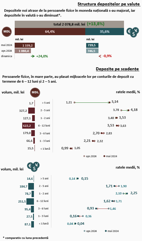 În luna mai 2024, depozitele noi1 atrase la termen (Infografic 1) au constituit 2 681,8 milioane lei, majorându-se cu 2,4 la sută față de luna aprilie 2024. Depozitele atrase în moneda națională au înregistrat o pondere majoră de 62,5 la sută și au însumat 1 676,9 milioane lei, în creștere cu 4,4 la sută față de luna precedentă. Depozitele atrase în valută au totalizat 1 004,9 milioane lei, fiind în descreștere cu 0,8 la sută față de luna precedentă.