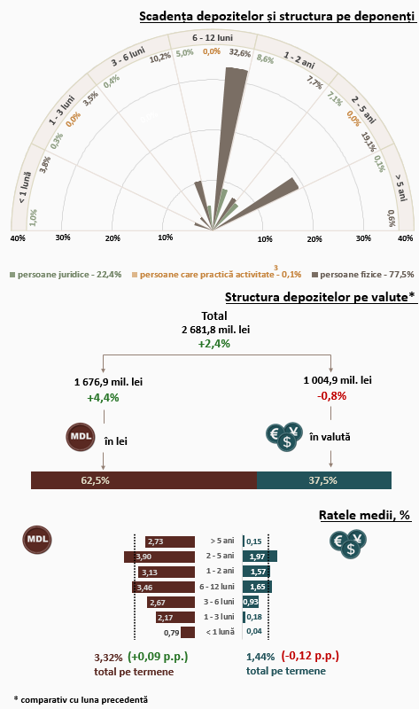 Din perspectiva termenelor de plasare, cea mai mare pondere în totalul depozitelor la termen le-a revenit depozitelor cu termene de la 6 până la 12 luni (37,6 la sută) și depozitelor cu termene de la 2 până la 5 ani (26,2 la sută).