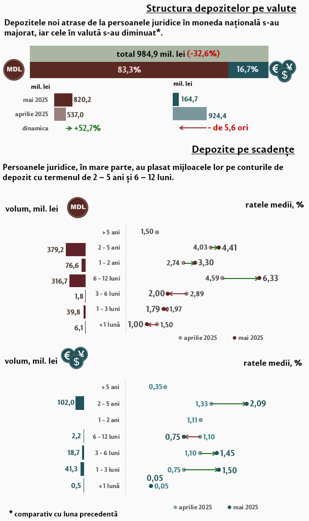 În mai 2025, comparativ cu luna precedentă, depozitele în moneda națională ale persoanelor juridice (Infografic 3) s-au majorat cu 52,7 la sută, iar cele în valută s-au diminuat de 5,6 ori. Depozitele în moneda națională ale persoanelor juridice au constituit 820,2 milioane lei, iar cele în valută – 164,7 milioane lei. Comparativ cu mai 2024, depozitele în moneda națională ale persoanelor juridice s-au majorat de 2,4 ori, iar cele în valută s-au diminuat cu 37,9 la sută.