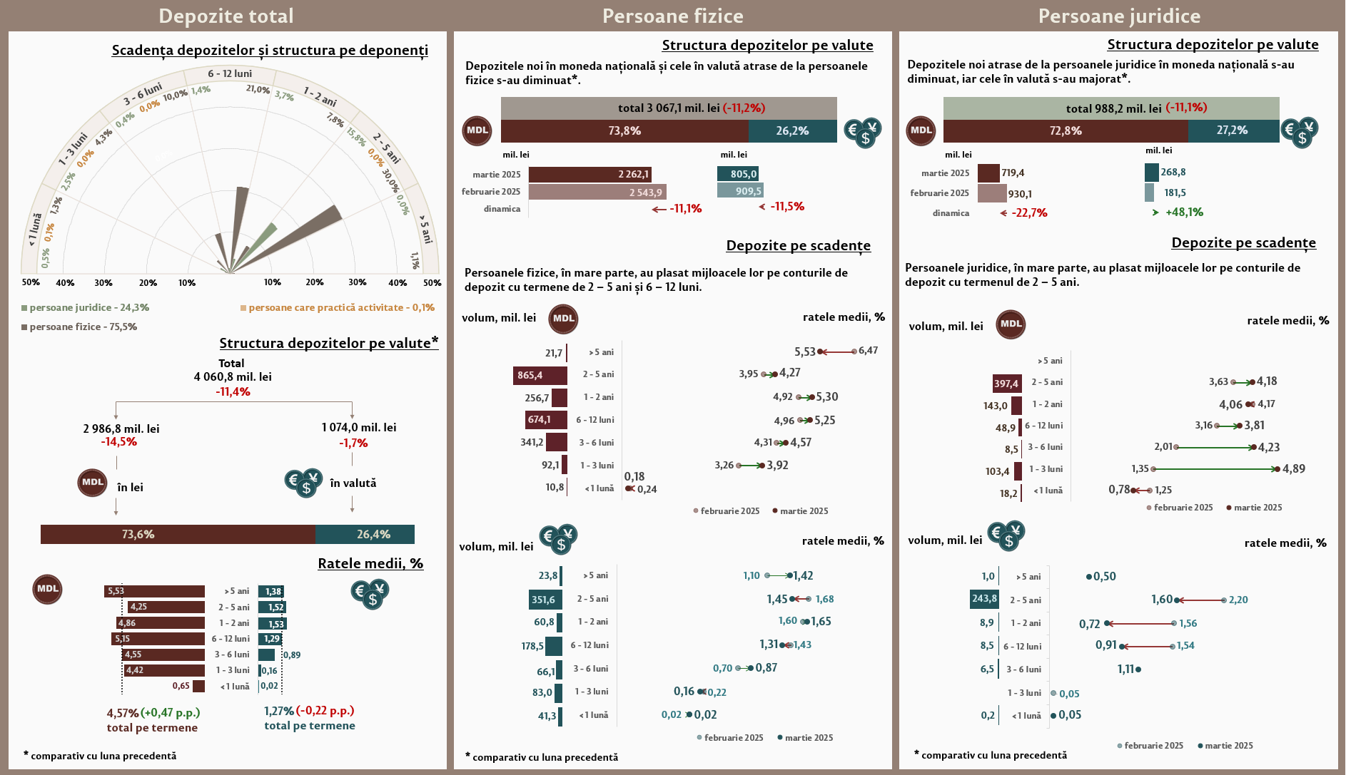 În luna martie 2025, depozitele noi1 atrase la termen (Infografic 1) au constituit 4 060,8 milioane lei, micșorându-se cu 11,4 la sută față de luna februarie 2025. Depozitele atrase în moneda națională au înregistrat o pondere de 73,6 la sută și au însumat 2 986,8 milioane lei, fiind în descreștere cu 14,5 la sută față de luna precedentă. Depozitele atrase în valută au totalizat 1 074,0 milioane lei, înregistrând o descreștere cu 1,7 la sută față de luna precedentă.