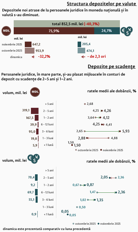 În noiembrie 2025, depozitele persoanelor juridice au constituit 852,5 milioane lei, fiind în descreștere cu 40,3 la sută față de luna precedentă, depozitele în moneda națională reprezintă 647,2 milioane lei (-32,2 la sută), iar cele în valută – 205,4 milioane lei (-de 2,3 ori). Comparativ cu noiembrie 2024, depozitele în moneda națională ale persoanelor juridice s-au majorat cu 10,9 la sută, iar cele în valută s-au micșorat cu 43,0 la sută.