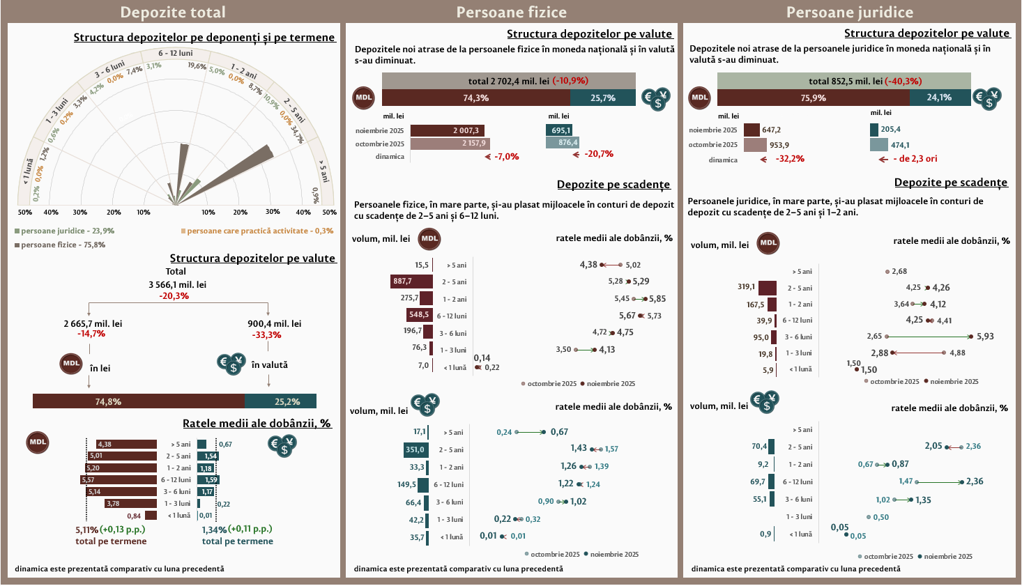 În luna noiembrie 2025, depozitele noi1 atrase la termen au constituit 3 566,1 milioane lei, micșorându-se cu 20,3 la sută față de luna octombrie 2025 (Infografic 1). Depozitele atrase în moneda națională au înregistrat o pondere de 74,8 la sută și au însumat 2 665,7 milioane lei, fiind în descreștere cu 14,7 la sută față de luna precedentă. Depozitele atrase în valută au totalizat 900,4 milioane lei, înregistrând o descreștere cu 33,3 la sută față de luna precedentă.