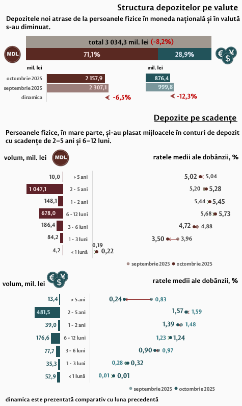 În luna octombrie 2025, depozitele noi1 atrase la termen au constituit 4 475,9 milioane lei, micșorându-se cu 1,5 la sută față de luna septembrie 2025 (Infografic 1). Depozitele atrase în moneda națională au înregistrat o pondere de 69,8 la sută și au însumat 3 125,2 milioane lei, fiind în descreștere cu 8,2 la sută față de luna precedentă. Depozitele atrase în valută au totalizat 1 350,7 milioane lei, înregistrând o creștere cu 18,3 la sută față de luna precedentă.