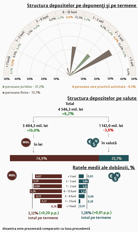 Rata medie nominală la depozitele noi atrase în moneda națională s-a majorat cu 0,20 puncte procentuale (p.p.) comparativ cu luna precedentă și a constituit 5,12 la sută. Rata medie nominală la depozitele în valută s-a majorat cu 0,01 p.p., constituind 1,38 la sută.