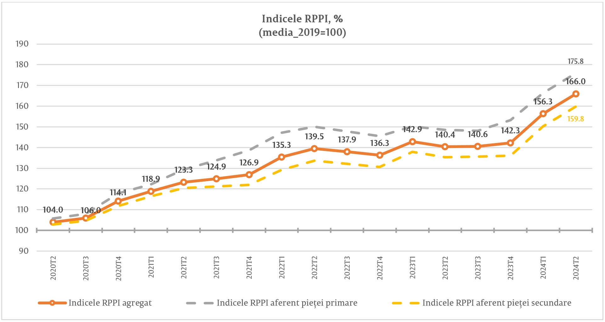 Indicele RPPI aferent prețului de ofertă pentru bunurile imobile prezentate pe piața primară a înregistrat valoarea de 175,8 la sută, fiind în creștere cu 5,8 la sută față de trimestrul I 2024, sau cu 18,3 la sută față de trimestrul II 2023.