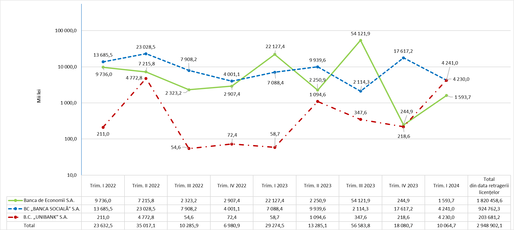 Diagrama încasărilor înregistrate de Banca de Economii S.A., BC „BANCA SOCIALĂ” S.A. și B.C. „UNIBANK” S.A. pe parcursul perioadei 31.03.2022 - 31.03.2024, inclusiv