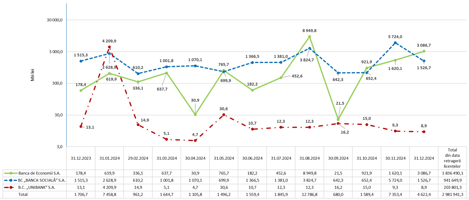 Figura 1. Diagrama încasărilor înregistrate de Banca de Economii S.A., BC „BANCA SOCIALĂ” S.A. și B.C. „UNIBANK” S.A. pe parcursul perioadei 31.12.2023 - 31.12.2024, inclusiv