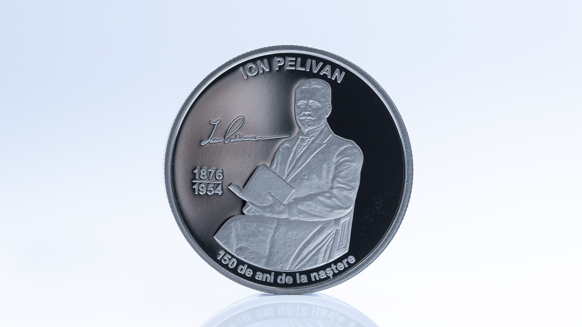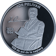 • inscripțiile cu majuscule „ION PELIVAN” și „150 de ani de la naștere” în arc de cerc.