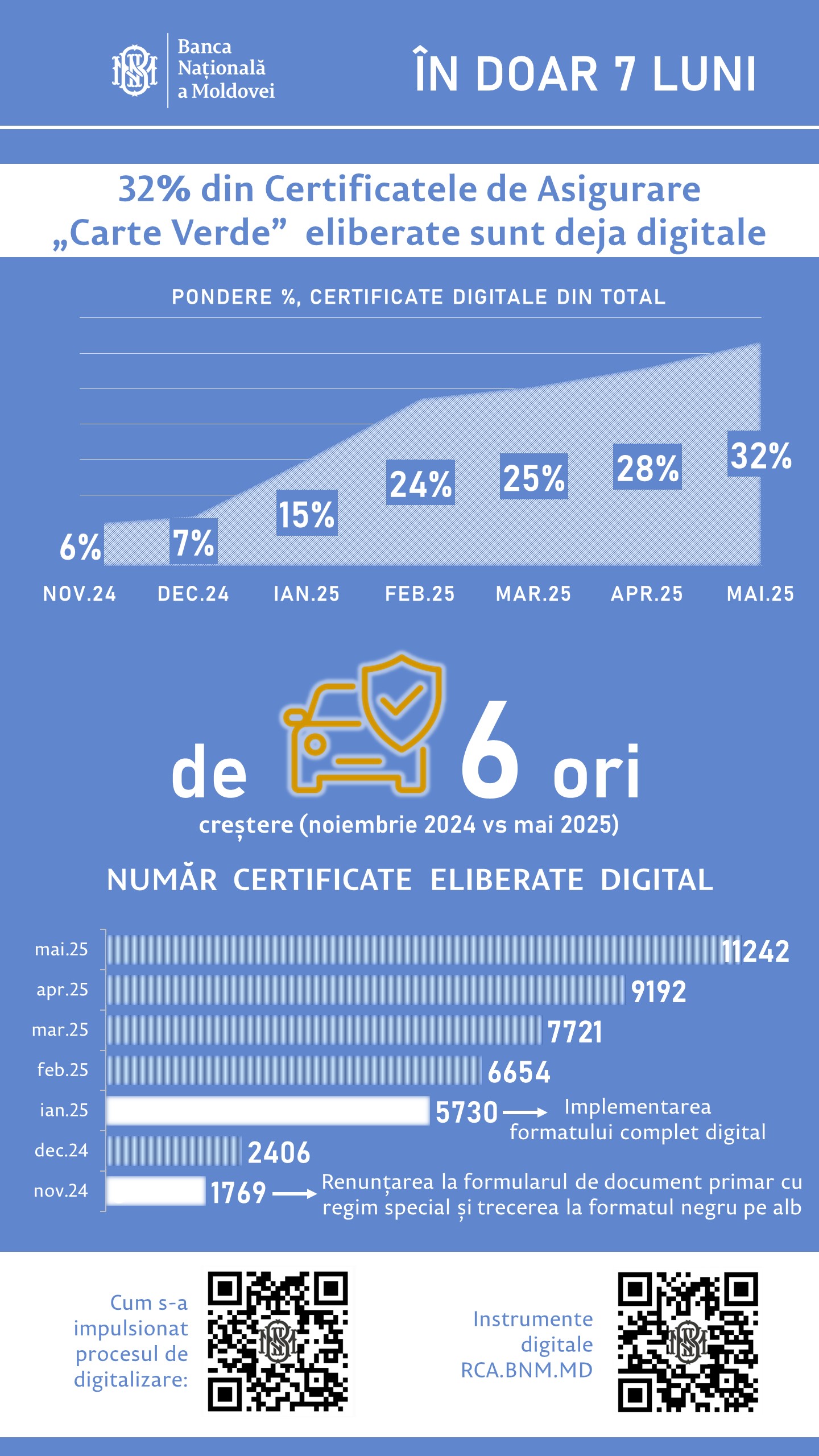 Această creștere considerabilă demonstrează eficiența instrumentelor digitale puse la dispoziție de Banca Națională a Moldovei (BNM), care au oferit pieței infrastructura necesară pentru procesarea programatică a contractelor de asigurare de răspundere civilă auto obligatorie internă și externă.