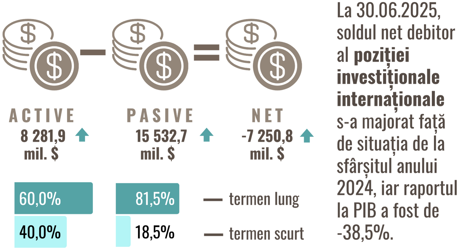 Poziția investițională internațională (PII) a Republicii Moldova, la 30.06.2025, a constituit -7 250,82 mil. USD, majorându-se cu 19,3 la sută, iar raportul dintre valoarea net debitoare a PII și PIB a constituit -38,5 la sută, fiind în creștere cu 5,1 p.p. față de situația de la sfârșitul anului 2024. Poziția activelor financiare externe a totalizat 8 281,91 mil. USD, majorându-se cu 5,4 la sută comparativ cu sfârșitul anului 2024, iar cea a pasivelor în valoare de – 15 532,72 mil. USD, în creștere cu 11,5 la sută. Raportul dintre poziția activelor și a pasivelor externe a constituit 53,3 la sută (-3,1 p.p. față de 31.12.2024).