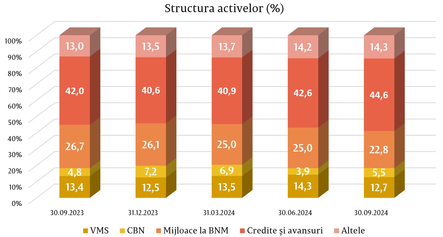În structura activelor, ponderea cea mai mare a revenit articolului din bilanț „Credite și avansuri la cost amortizat”, care a constituit 44,6% (73 470,3 milioane lei), fiind în majorare cu 4,0 puncte procentuale (p.p.) față de finele anului precedent. Ponderea mijloacelor plasate la BNM a constituit 22,8% (37 563,6 milioane lei), fiind în descreștere cu 3,3 p.p., iar ponderea investițiilor băncilor în valorile mobiliare de stat și în certificatele BNM a reprezentat 18,3% (30 135,8 milioane lei), fiind în descreștere cu 1,5 p.p. Restul activelor, care constituie 14,3% (23 558,9 milioane lei), sunt menținute în alte bănci în numerar, imobilizări corporale, imobilizări necorporale etc. Ponderea acestora s-a majorat cu 0,8 p.p. comparativ cu sfârșitul anului 2023.