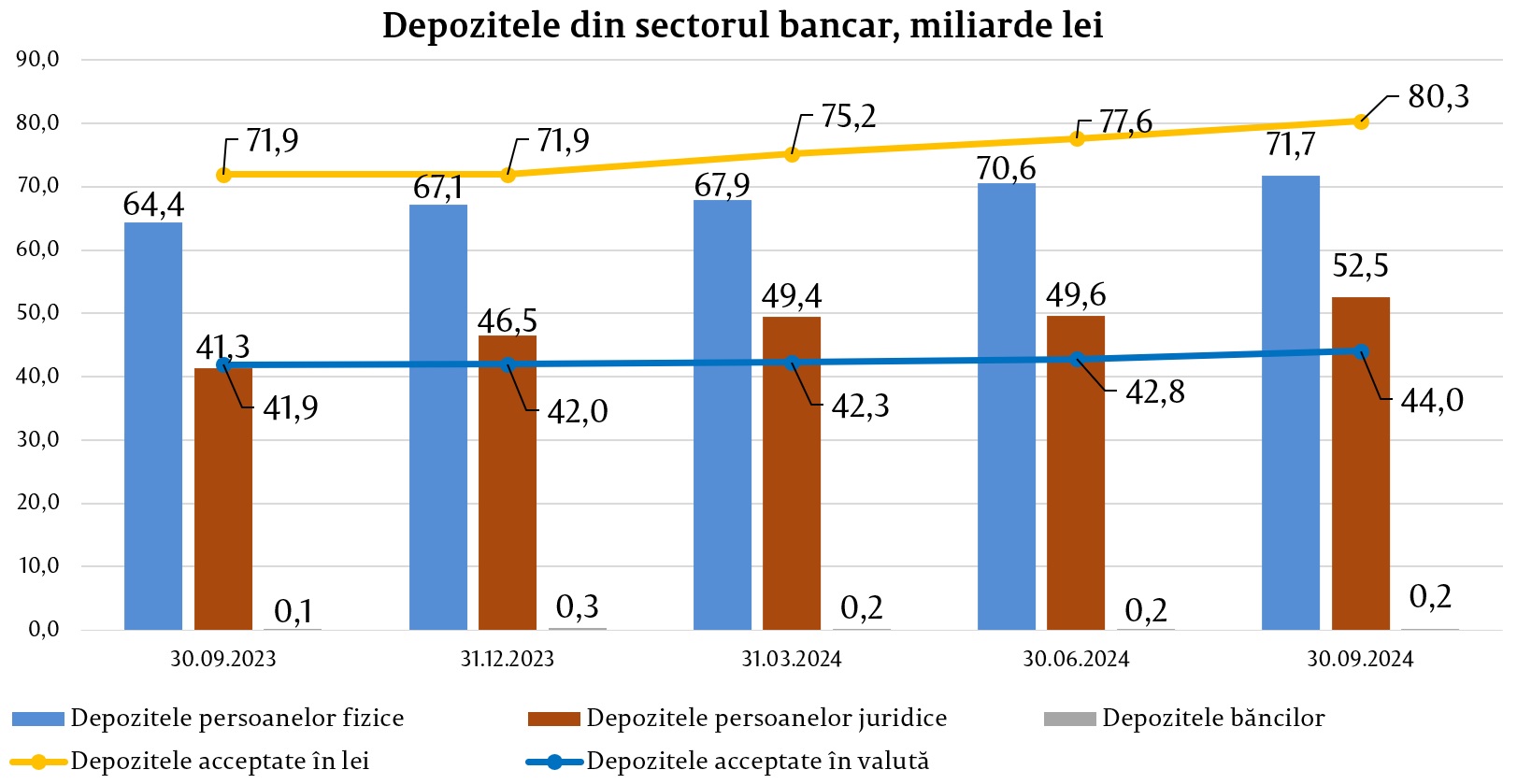 În totalul depozitelor, 64,6% au revenit depozitelor în lei, soldul majorându-se cu 8 419,6 milioane lei (11,7%) comparativ cu sfârșitul anului precedent și a constituit 80 317,2 milioane lei la 30.09.2024. Depozitele în valută au constituit 35,4% din totalul depozitelor, soldul acestora s-a majorat pe parcursul perioadei de referință cu 2 075,9 milioane lei (4,9%), alcătuind 44 025,1 milioane lei.