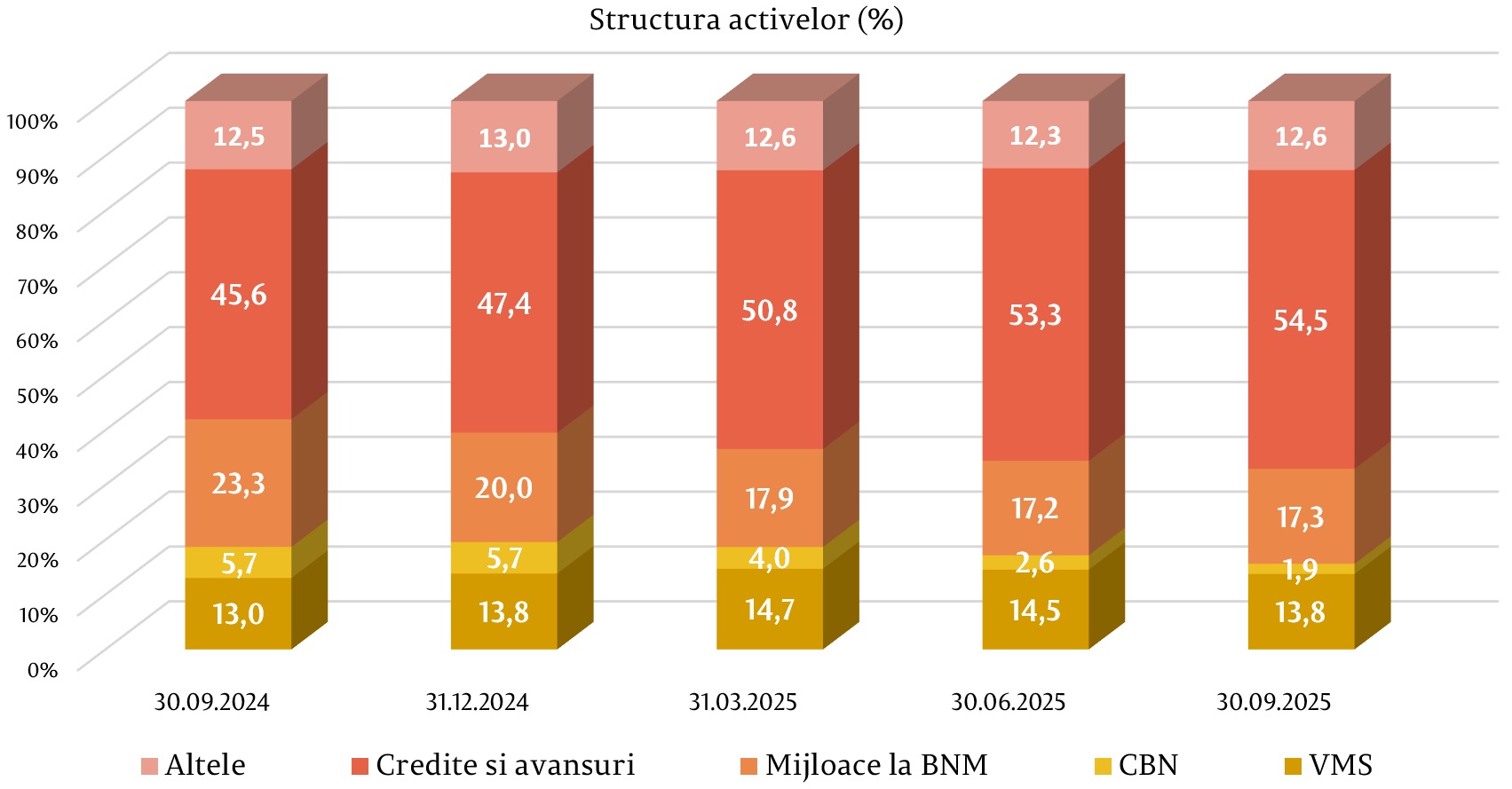 În structura activelor, ponderea cea mai mare a revenit creditelor și avansurilor la cost amortizat, care a constituit 54,5% (98 647,9 milioane lei), fiind în majorare cu 7,1 puncte procentuale (p.p.) față de finele anului precedent. Ponderea mijloacelor plasate la BNM a constituit 17,3% (31 357,4 milioane lei), fiind în descreștere cu 2,7 p.p., iar ponderea investițiilor băncilor în valorile mobiliare de stat și în certificatele BNM a reprezentat 15,7% (28 281,1 milioane lei), fiind în descreștere cu 3,8 p.p. Restul activelor, care constituie 12,6% (22 784,8 milioane lei), sunt menținute în alte bănci în numerar, imobilizări corporale, imobilizări necorporale etc. Ponderea acestora s-a micșorat cu 0,4 p.p. comparativ cu sfârșitul anului 2024.
