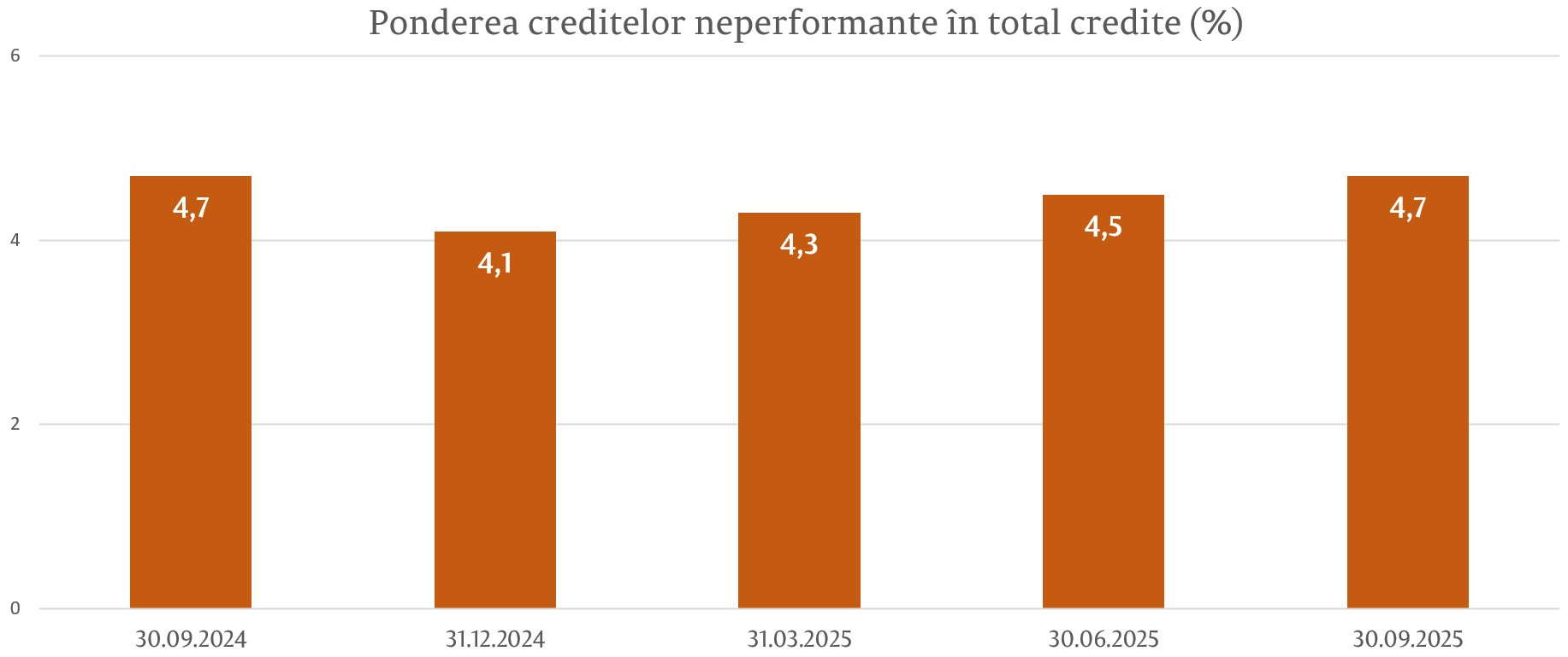 Ponderea creditelor neperformante în totalul creditelor (prudențial) la 30.09.2025 a constituit 4,7%, fiind în majorare cu 0,6 p.p. față de finele anului precedent, însă menținându-se aproape de cele mai scăzute niveluri istorice. Totodată, în perioada analizată s-a micșorat ponderea creditelor expirate în totalul creditelor cu 0,5 p.p., constituind 1,4%.