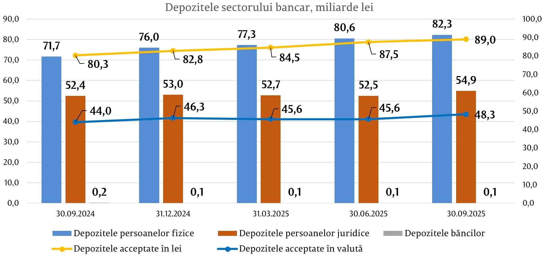 În totalul depozitelor, 64,8% au revenit depozitelor în lei, soldul majorându-se cu 6 229,4 milioane lei (7,5%) comparativ cu sfârșitul anului precedent și a constituit 88 997,2 milioane lei la 30.09.2025. Respectiv, depozitele în valută au constituit 35,2% din totalul depozitelor, soldul acestora, de asemenea, s-a majorat pe parcursul perioadei de referință cu 2 005,9 milioane lei (4,3%), alcătuind 48 329,8 milioane lei.