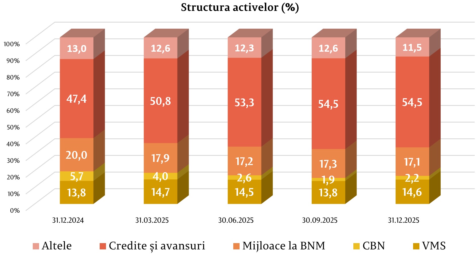În structura activelor, ponderea cea mai mare a revenit creditelor și avansurilor la cost amortizat, care a constituit 54,5% (103 604,6 milioane lei), fiind în majorare cu 7,1 puncte procentuale (p.p.) față de finele anului precedent. Ponderea mijloacelor plasate la BNM a constituit 17,1% (32 557,6 milioane lei), fiind în descreștere cu 2,9 p.p., iar ponderea investițiilor băncilor în valorile mobiliare de stat și în certificatele BNM a reprezentat 16,8% (32 015,4 milioane lei), fiind în descreștere cu 2,7 p.p. Restul activelor, care constituie 11,5% (21 877,5 milioane lei), sunt menținute în alte bănci, în numerar, imobilizări corporale, imobilizări necorporale etc. Ponderea acestora s-a micșorat cu 1,5 p.p. comparativ cu sfârșitul anului 2024.