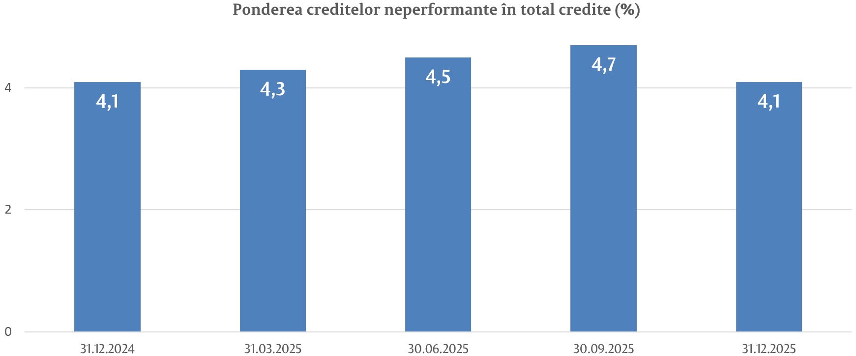 Ponderea creditelor neperformante în totalul creditelor (prudențial) la 31.12.2025 a constituit 4,1%, fiind la același nivel față de finele anului precedent, dar menținându-se la cele mai scăzute niveluri istorice. Totodată, în perioada analizată s-a micșorat ponderea creditelor expirate în totalul creditelor cu 0,5 p.p., constituind 1,4%.