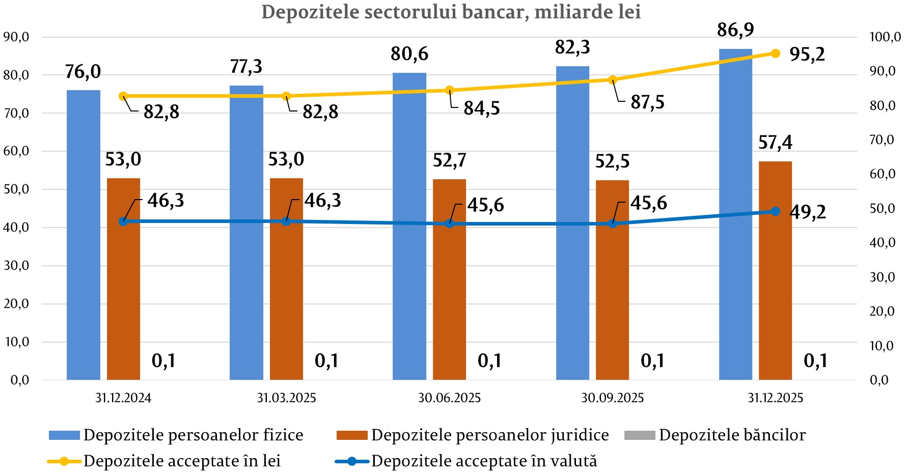 În totalul depozitelor, 65,9% au revenit depozitelor în lei, soldul majorându-se cu 12 474,3 milioane lei (15,1%) comparativ cu sfârșitul anului precedent și a constituit 95 242,1 milioane lei la 31.12.2025. Respectiv, depozitele în valută au constituit 34,1% din totalul depozitelor, soldul acestora, de asemenea, s-a majorat pe parcursul anului cu 2 856,7 milioane lei (6,2%), alcătuind 49 180,7 milioane lei.