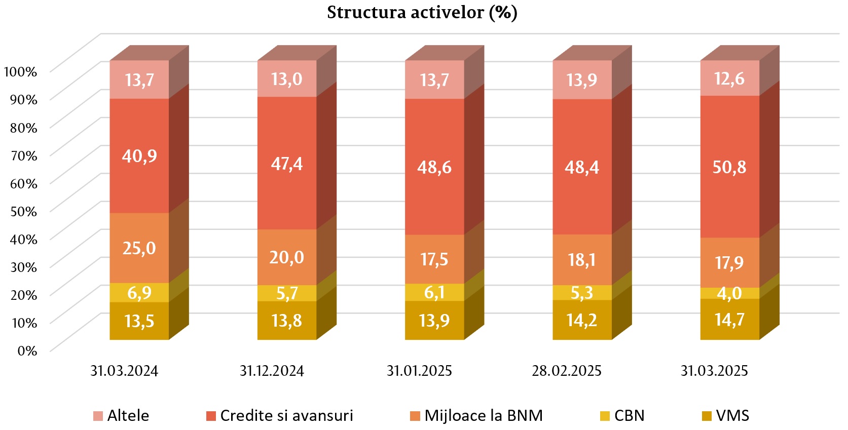 În structura activelor, ponderea cea mai mare a revenit articolului din bilanț „Credite și avansuri la cost amortizat”, care a constituit 50,8% (87 708,7 milioane lei), fiind în majorare cu 3,4 puncte procentuale (p.p.) față de finele anului precedent. Ponderea mijloacelor plasate la BNM a constituit 17,9% (30 845,5 milioane lei), fiind în descreștere cu 2,1 p.p., iar ponderea investițiilor băncilor în valorile mobiliare de stat și în certificatele BNM a reprezentat 18,7% (32 235,1 milioane lei), fiind în descreștere cu 0,9 p.p. Restul activelor, care constituie 12,6% (21 814,4 milioane lei), sunt menținute în alte bănci în numerar, imobilizări corporale, imobilizări necorporale etc. Ponderea acestora s-a micșorat cu 0,4 p.p. comparativ cu sfârșitul anului 2024.