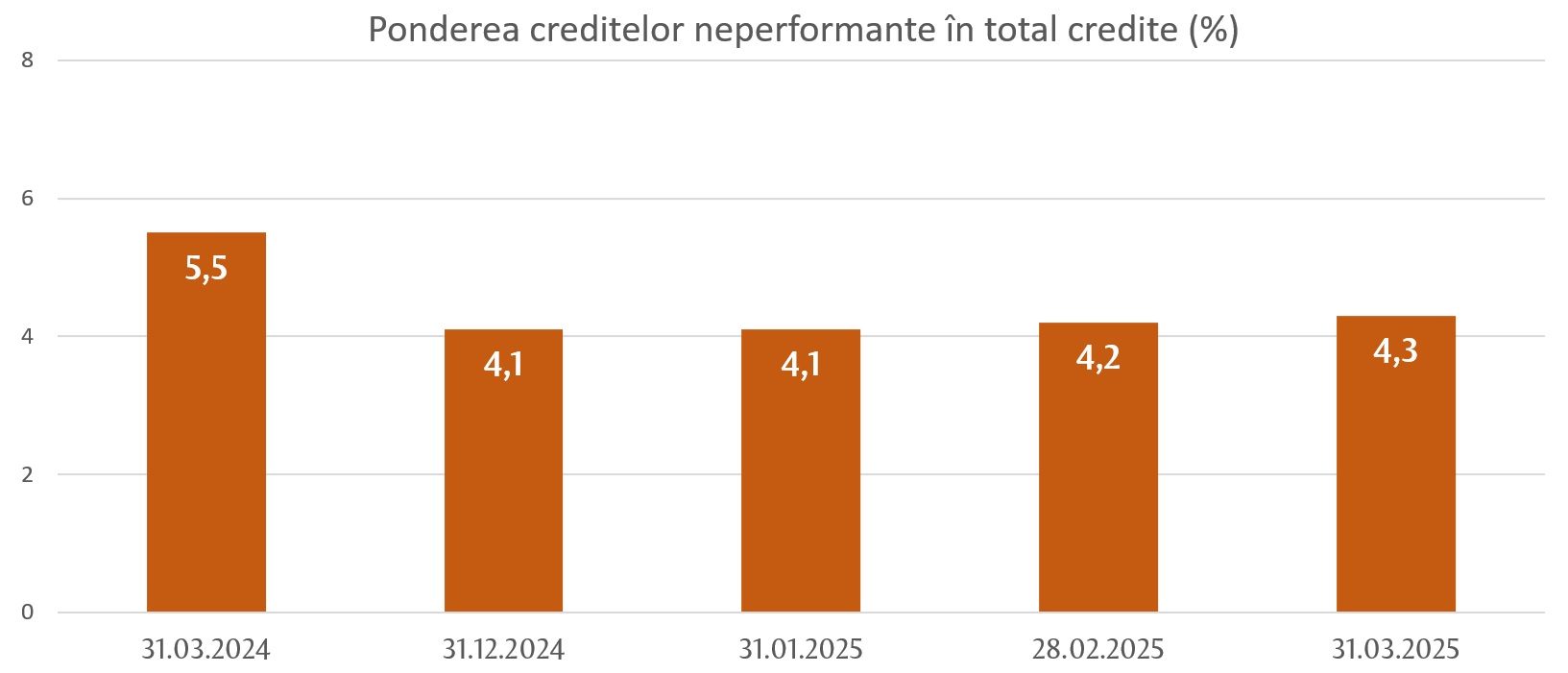 Pe parcursul perioadei de referință, ponderea creditelor neperformante (substandard, dubioase și compromise) în totalul creditelor s-a majorat cu 0,2 p.p., constituind 4,3% la 31.03.2025, indicatorul menționat variind de la 3,1% până la 8,1%, în funcție de bancă.
