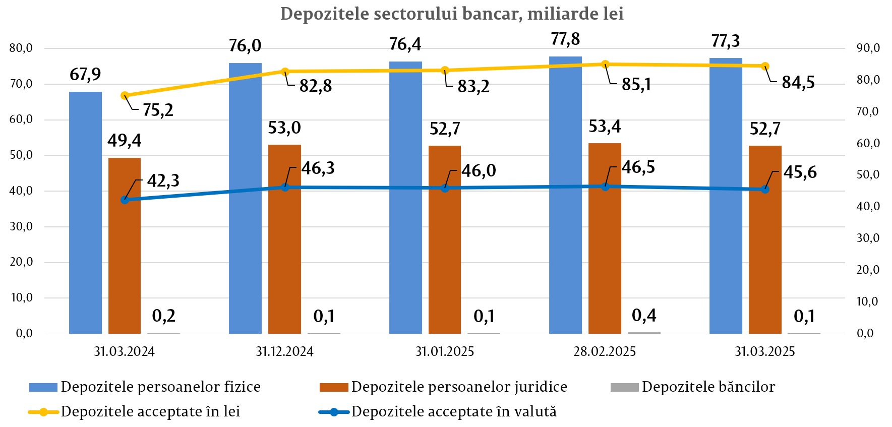 În totalul depozitelor, 65,0% au revenit depozitelor în lei, soldul majorându-se cu 1 778,2 milioane lei (2,1%) comparativ cu sfârșitul anului precedent și a constituit 84 546,0 milioane lei la 31.03.2025. Depozitele în valută au constituit 35,0% din totalul depozitelor, soldul acestora s-a micșorat pe parcursul perioadei de referință cu 728,7 milioane lei (1,6%), alcătuind 45 595,3 milioane lei.