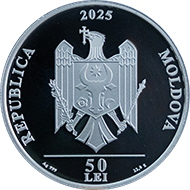 • „Ag 999”, valoarea nominală „50 LEI” și „22,0 g” în exergă.