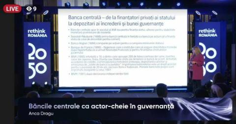 Guvernatoarea Băncii Naționale a Moldovei, Anca Dragu, a susținut astăzi un discurs cu tema „Băncile centrale ca actor-cheie în guvernanță”, în cadrul summit-ului Rethink România, evidențiind rolul fundamental al bunei guvernanțe în consolidarea democrației și a stabilității economice.