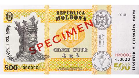 Bancnota modernizată cu valoarea nominală de 500 LEI, specimenul anului 2015, cu semnătura în facsimil a guvernatorului Băncii Naționale, Anca-Dana Dragu.