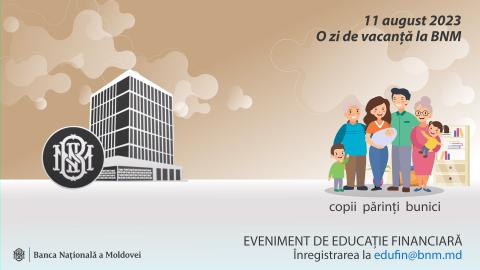 Banca Națională a Moldovei va organiza la 11 august 2023 evenimentul de educație financiară „O zi de vacanță la BNM”, pe care îl desfășoară în mod tradițional pentru publicul larg în perioada estivală.