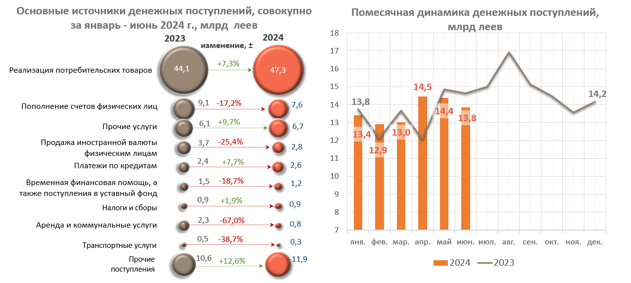 При этом, в январе – июне 2024 г. значительно сократились поступления наличных денежных средств на текущие и депозитные счета физических лиц на 1 575,2 млн леев (-17,2%), поступления от аренды и коммунальных услуг на 1 534,6 млн леев (-67,0%), а также сократились поступления наличности от продажи иностранной валюты физическим лицам на 941,3 млн леев (-25,4%), составив 2 762,5 млн леев (эквивалент 155,6 млн долларов США3).