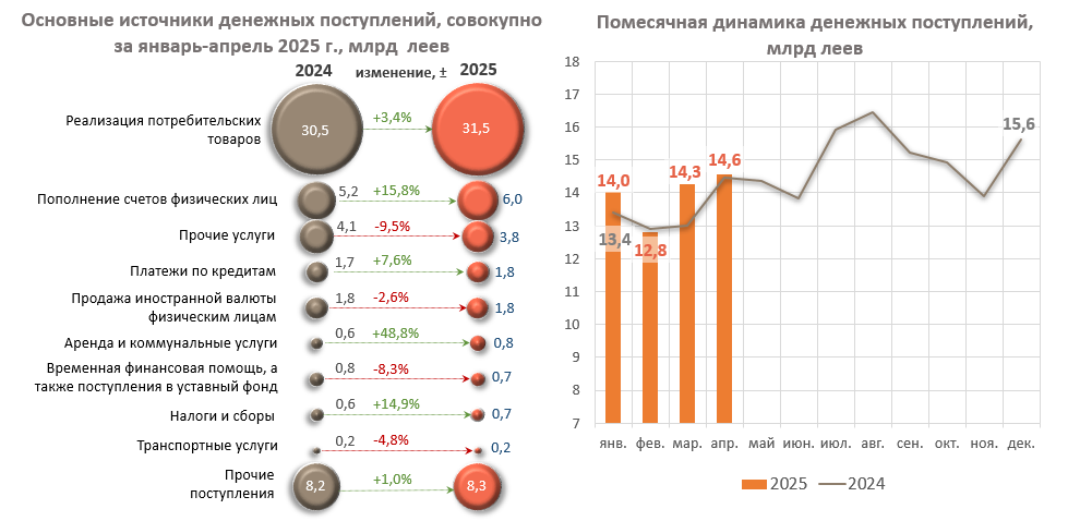 Наличные денежные поступления от продажи потребительских товаров (независимо от канала сбыта) значительно увеличились на 1 025,2 млн леев (+3,4%), составив 31 506,7 млн леев, что составляет 56,6% от общего объёма наличных денежных поступлений (Диаграмма № 1). Также значительно увеличились поступления наличных денежных средств на текущие и депозитные счета физических лиц на 818,2 млн леев (+15,8%), и поступления от аренды и коммунальных услуг на 273,9 млн леев (+48,8%). Денежные поступления от платежей по кредитам увеличились на 128,0 млн леев (+7,6%).