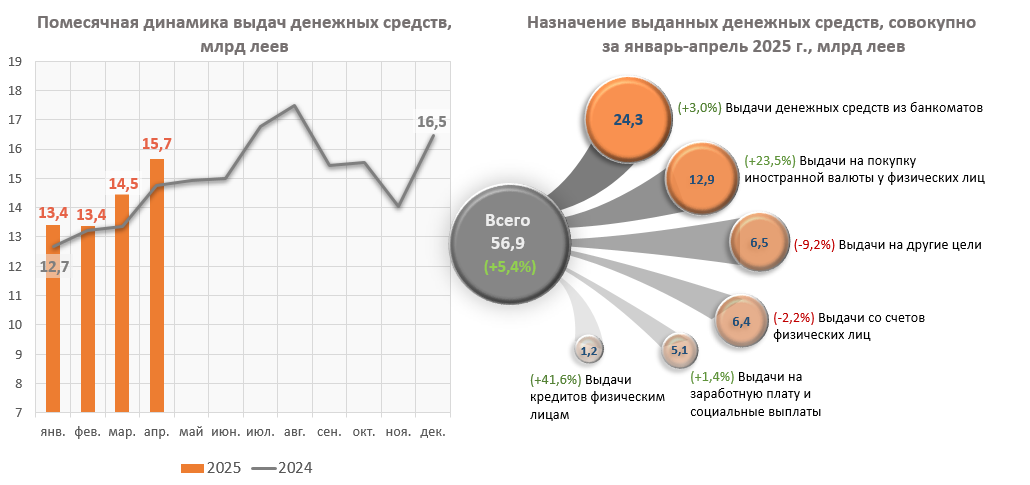 Значительное влияние на динамику выдачи наличных средств из касс банков оказало увеличение объема выдачи наличных денег на покупку валюты у физических лиц на 2 455,8 млн леев, что составило 12 888,8 млн леев (эквивалент 662,7 млн EUR4), с долей 22,7% от общего объема выдачи наличных. Также был зафиксирован значительный рост объема выдачи наличных денежных средств из банкоматов на 703,9 млн леев (+3,0%), и выдачи кредитов физическим лицам на 487,5 млн леев (+41,6%).