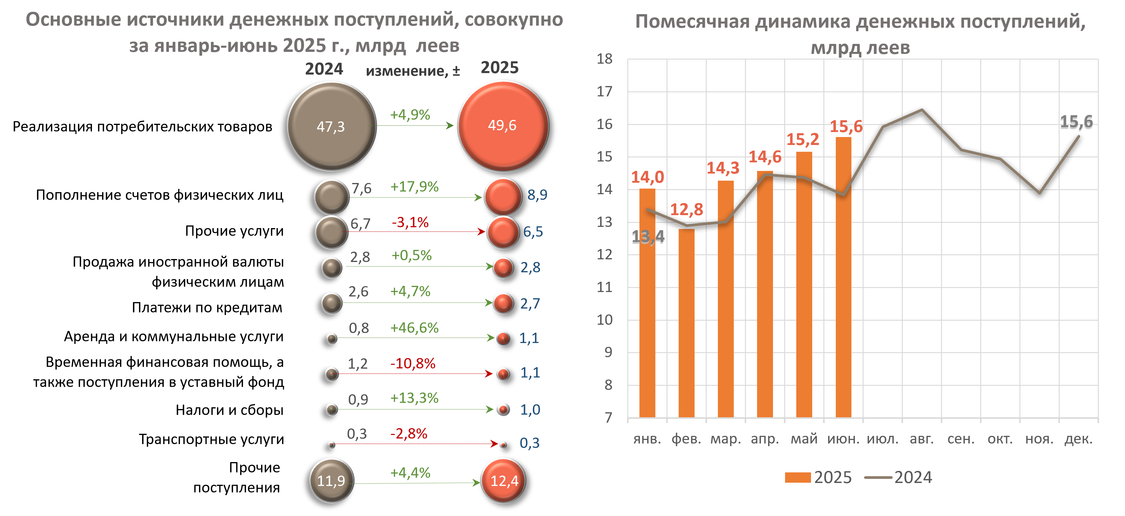 Вместе с тем, в январе-июне 2025 г. выдачи наличности на другие цели снизились на 1 027,9 млн леев (-9,2%).