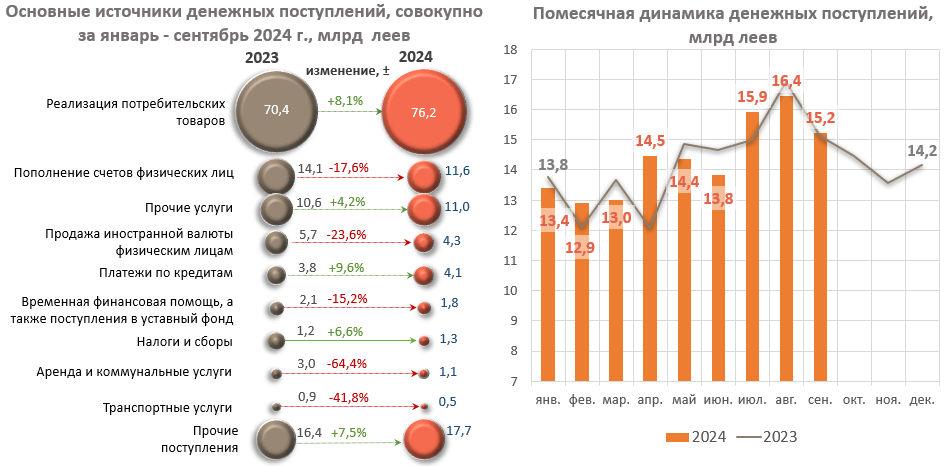 При этом, в январе – сентябре 2024 г. значительно сократились поступления наличных денежных средств на текущие и депозитные счета физических лиц на 2 472,1 млн леев (-17,6%), поступления от аренды и коммунальных услуг на 1 959,4 млн леев (-64,4%), а также уменьшилось поступление наличности от продажи иностранной валюты физическим лицам на 1 335,5 млн леев (-23,6%), составив 4 328,5 млн леев (эквивалент 244,5 млн долларов США3).