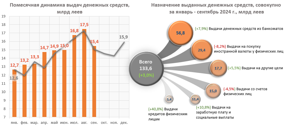 Эта динамика была обусловлена, с одной стороны, увеличением выдач наличных денежных средств из банкоматов на 4 148,8 млн леев (+7,9%), выдач наличности на оплату труда и социальные выплаты на 1 117,8 млн леев (+10,8%), выдач кредитов физическим лицам на 981,5 млн леев (+40,8%), и выдач наличности в других целях на 923,6 млн леев (+5,5%), а с другой стороны, снижением выдач наличных для покупки валюты у физических лиц на 2 621,6 млн леев (-8,2%) и выдач наличных денежных средств со счетов физических лиц на 704,8 млн леев (-4,5%).