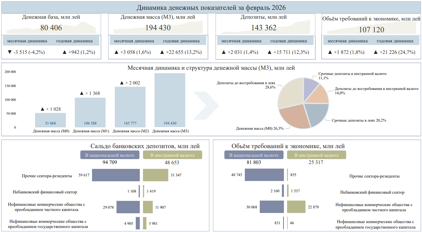 В феврале 2026 г. денежная база1 составила 80 406 миллиона леев, уменьшившись на 4,2% по сравнению с январем 2026 г.