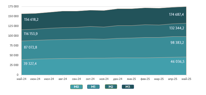 Денежная масса M25 увеличилась на 1 587,5 миллиона леев или на 1,2% по сравнению с апрелем 2025 г. и составила 132 344,2 миллиона леев, что на 13,9% выше по сравнению с аналогичным периодом прошлого года (Диаграмма 2).