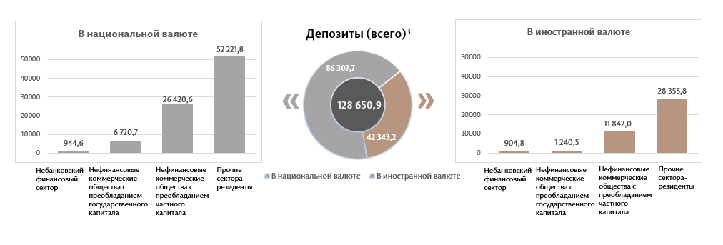 Сальдо депозитов в национальной валюте увеличилось на 946,4 миллиона леев по сравнению с предыдущим месяцем, составив 86 307,7 миллиона леев или 67,1% от общего сальдо депозитов. В то же время сальдо депозитов в иностранной валюте (пересчитанное в леи) уменьшилось по сравнению с предыдущим месяцем на 188,4 миллиона леев до уровня 42 343,2 миллиона леев или 32,9% от общего сальдо депозитов (диаграмма 3).