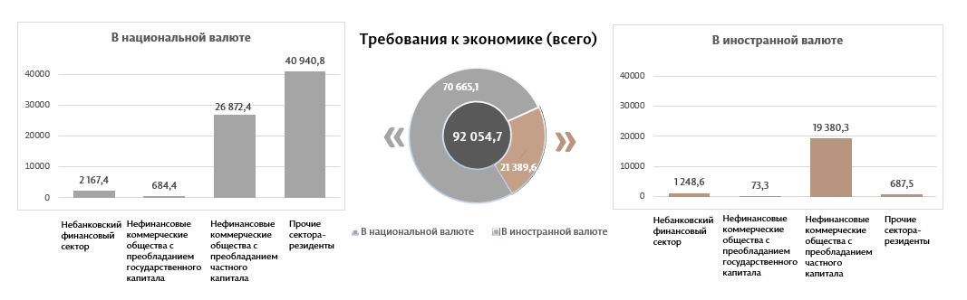 10. Требования к национальной экономике представляют собой требования банковской системы Республики Молдова (включая банки, находящиеся в процессе ликвидации), в национальной валюте и в иностранной валюте, к нефинансовым коммерческим компаниям с преобладающим государственным или частным капиталом, к другим секторам-резидентам. В этот показатель входят: кредиты и займы (включая просроченную задолженность), непогашенные проценты по кредитам; долговые ценные бумаги и акции; другие требования.