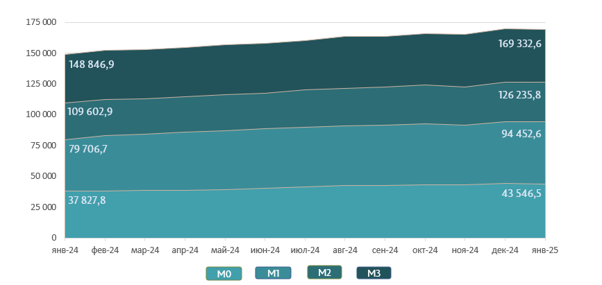 Денежная масса M36 уменьшилась на 268,9 миллиона леев или на 0,2% по сравнению с декабрём 2024 г. и составила 169 332,6 миллиона леев, что на 13,8% выше по сравнению с тем же периодом прошлого года.